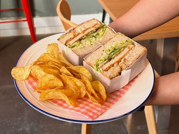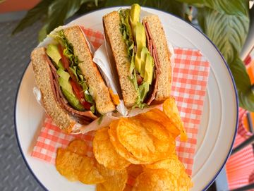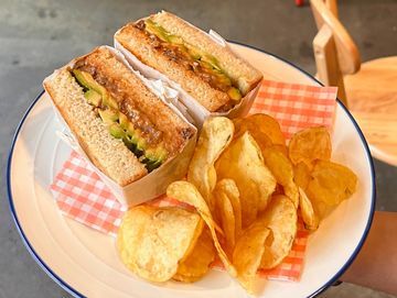 Richmonds bacon, romaine lettuce, tomato, plant based mayonnaise and avocado in our homemade sandwich bread
