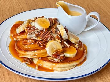 Fresh pancakes, pecans, banana slices served with a rich homemade salted caramel sauce