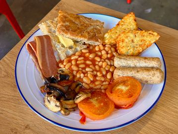 Hash browns, PB Richmond sausages, baked beans, homemade sourdough, roasted tomatoes and mushrooms