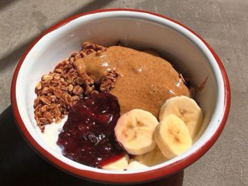 Plain soy yoghurt, homemade granola and nut butter, berry compote and fresh bananas with a drizzle of maple syrup