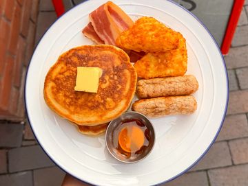 Fresh pancakes, hash browns, PB Richmond sausages and bacon with maple syrup and vegetable butter