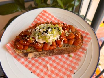 Gochujang glazed butter beans, green onion yogurt, homemade sourdough topped with sesame seeds