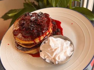 Fresh pancakes, homemade mixed berry compote and soft whipped cream