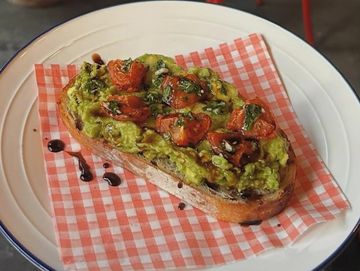 Smashed avocado, roasted tomatoes topped with parsley, garlic and balsamic on our homemade sourdough