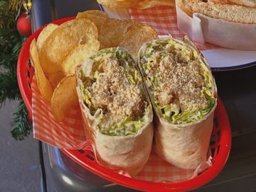 Breaded chicken, caesar dressing, fresh lettuce and red onion, garlic croutons and cashew parmesan
